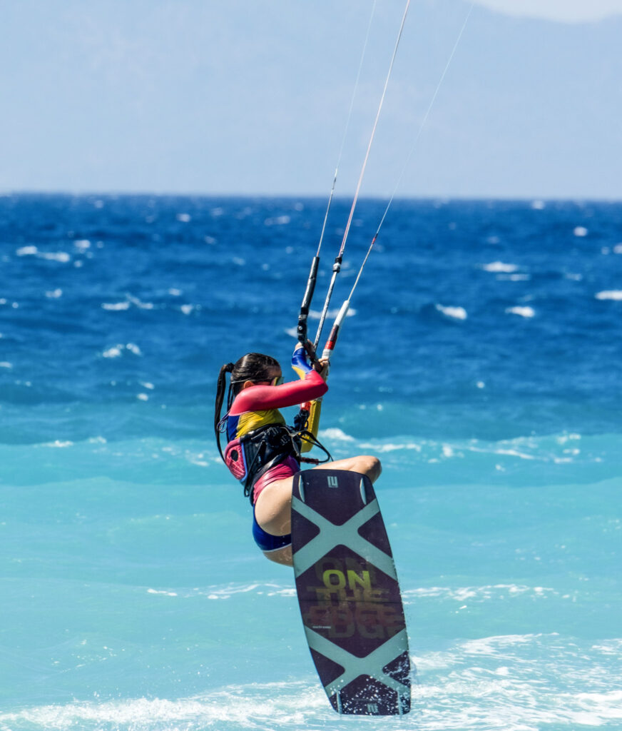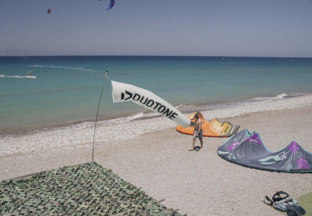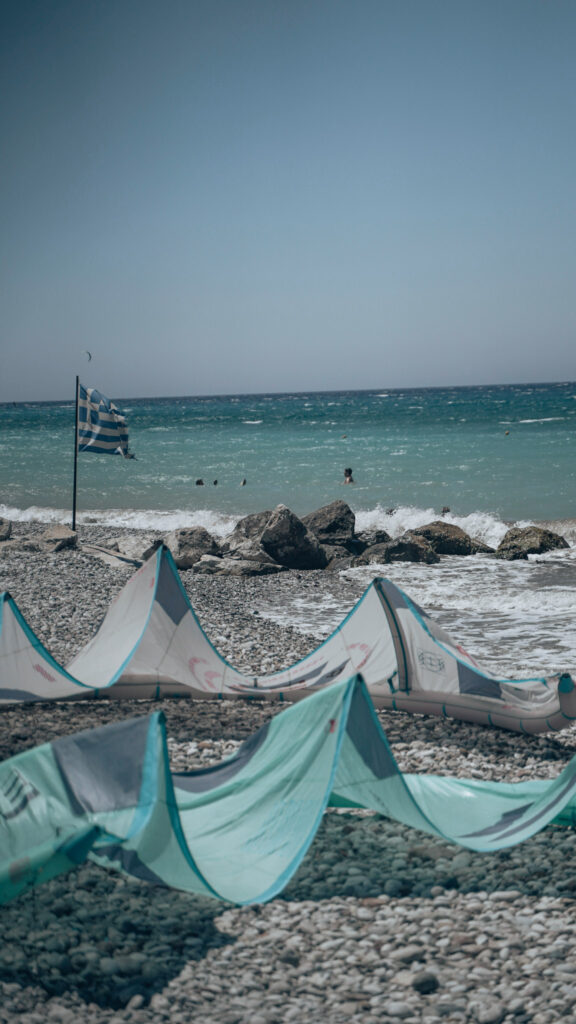 Thanks to my friend I discovered the AirRiders Kite Pro Center at Kremasti Beach. The setup is perfect: a compressor to pump your kite, a shaded chill area, gear rentals, and friendly assistance with launching and landing on the pebbly beach. There’s even yoga! The water is warm and blue, and there’s someone keeping an eye on you at all times. Windy every day—what a kitesurfer’s dream!